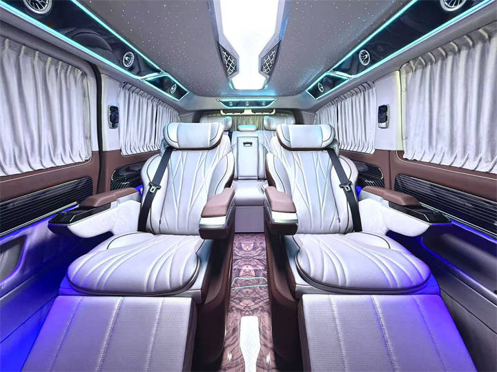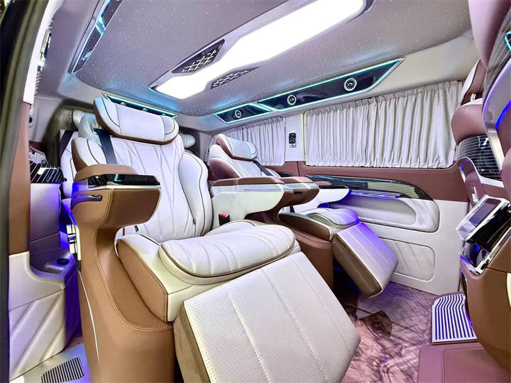 大家好,商务车解说,我是鲁秋君,今天我们来介绍一个奔驰威霆改装商务车,威霆这款车子的车身尺寸在7座的mpv商务车中非常的具有优势,车长5米37,车宽1米92,车高在1米93。蓝牌c照即可以驾驶,同样也是属于7座车型中空间比较大的一个尺寸。搭载的是2.0t,9at的发动机,配备了48伏的轻混系统,在起步上更加的省油。作为一线豪华品牌的奔驰系列,威霆这款车子素车是非常简单单调的,同样价格也不高。裸车大概在20多万即可以,那升级改装之后的车子则上升到了30多万。