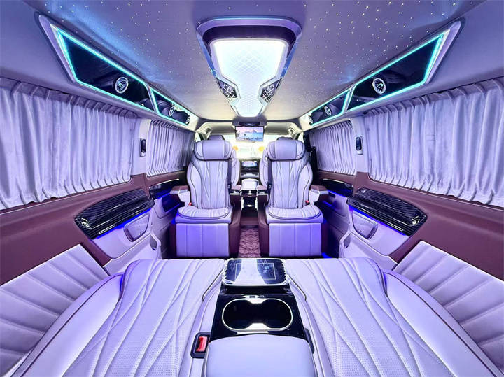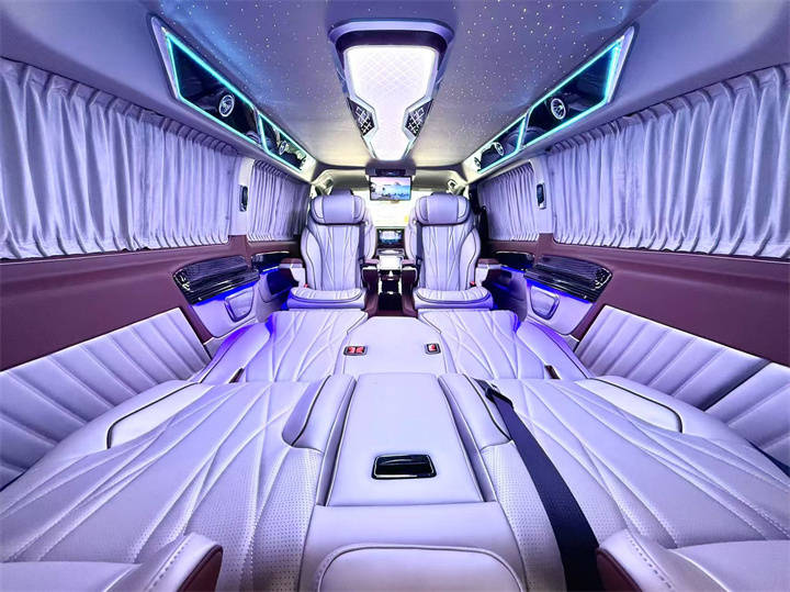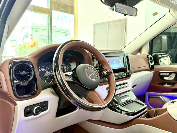 今天我们来看的这一台则是升级改装之后的车型,首先外观上改装了v300的新款大前脸,三眼皮的led大灯,加上帷幕的小高顶,以及后尾翼,侧边的电动门和电动尾门还有转向灯都有所改变。在周边上也加装了车窗镀铬条,当然如果需要更高级的改装,轮毂上也可以升级,外观上也有多款可以选择。我们进入到内饰去看一下有什么不一样。