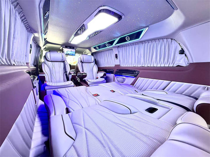 除此之外从细节方面来看也是各有特色,首先顶部是无线网络电视机,用的是吸顶的电视,增加了车里面的空间,又保留了后方的娱乐系统。顶部用的是内增高的一个大顶,它使我们的头部空间更加的宽敞,星空顶顶灯氛围灯相互搭配,氛围感又很好。地板用的是花纹的高光镜面的地板,跟车的颜色很搭配,也显高级。总的来说改装看细节,看品质,看做工,我们的改装威霆商务车拿出去绝对是能撑得住场面的,大气稳重,品质又高。那么你觉得怎么样呢?欢迎在下方点赞评论加关注,我们一起来讨论一下。