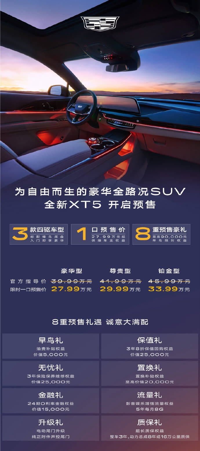 这次凯迪拉克XT5的预售权益够直接:5000元定金=9万元的权益包,包括:5,000元油费、3年8折保值回购权益(价值25,000元无)、3年保险保养维修权益(价值25,000元)、置换补贴(最高20,000元)、两年0利率、5年每月8G流量包(价值15,000元)、免费升级声控尾门、整车3年+动力总成8年或16万公里质保。