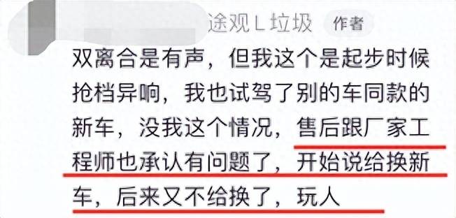 去4S店多次检查,起初4S店和厂家工作人员承认了变速箱有问题,并可申请换新车,但后又否认,表示变速箱异响属于正常现象。