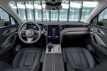 内饰方面,红旗HS7共配备了三块液晶大屏,科技感得到了很大的提升。三辐式多功能方向盘立体感十足,大面积的皮质材料包裹以及木纹装饰的加入也突显了豪华感。此外,新车还配备了电子挡把、电子手刹、自动驻车等配置。