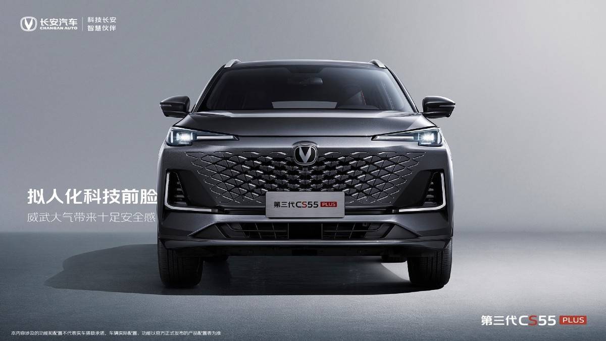外观方面,第三代CS55PLUS塑造出一种拟人化的视觉效果,展现出傲视群雄的王者姿态。无边界设计的立方格栅和一体式LED大灯,为新车注入了非常多的科技元素。