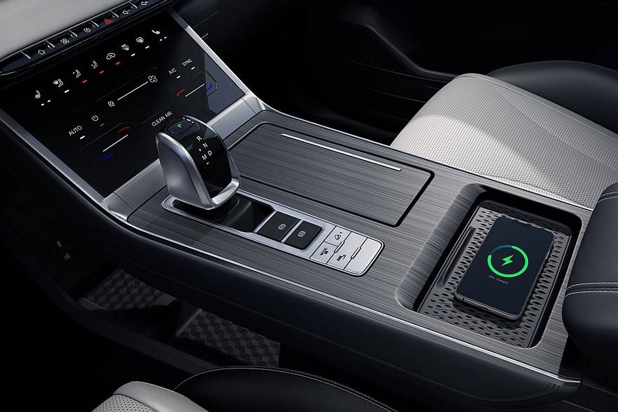 在中控台上有一个电子挡把,右侧是一个杯架,扶手箱前面有一个无线充电面板,电子挡把前面有一个空调触控面板,上方还有一排物理按键。