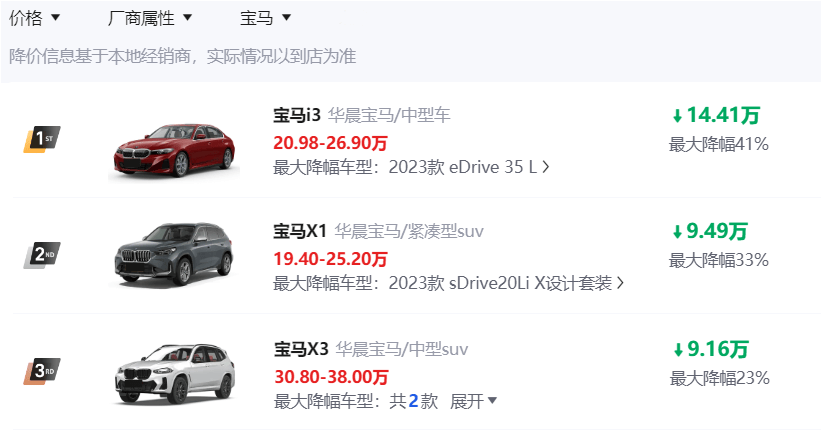 宝马品牌的主力车型均在“以价换量”,优惠幅度至少也会接近10万元!宝马X3自然也不例外,其目前门店最高优惠幅度可以达到9.16万元;当然也有门店会提供更高的优惠方案,但是前提总会是要求选择分期购车和宝马金融,实际购车成本并不是很划算。