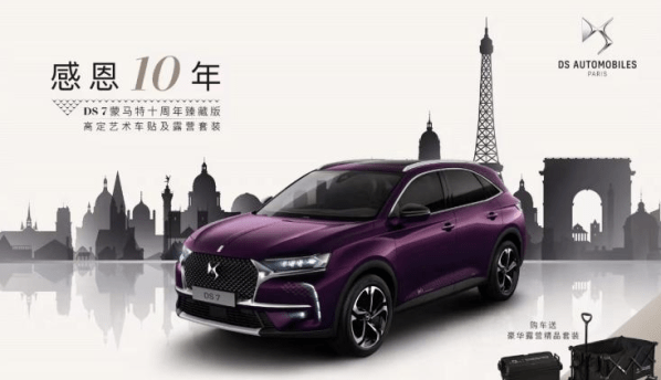 【智车派新闻】众所周知,不少汽车品牌还在进入某一市场一定年份后,会根据当地市场需求推出特制版车型。11月10日,为庆祝进入中国市场十周年,DS汽车宣布推出DS 7蒙马特十周年臻藏版,新车售价24.99万元。此外,DS汽车还为中国粉丝特别提供了专享“十周年典藏级高定艺术车贴”和“专属露营套装”。