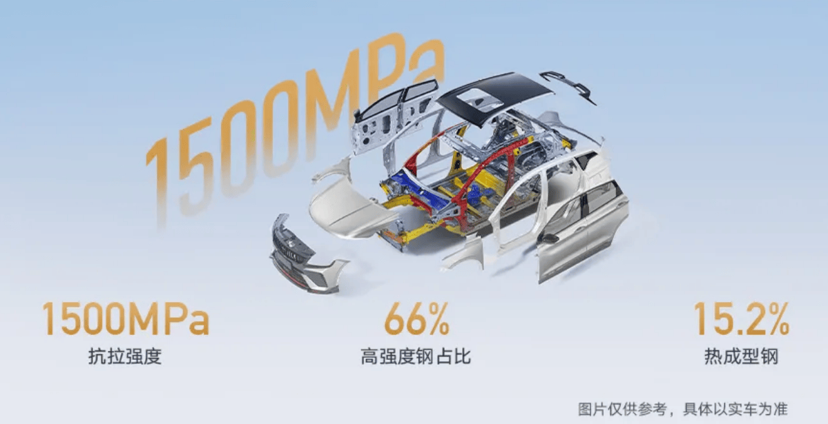 安全的底气,首先来自“钢筋铁骨”的车身结构。缤越超能Max采用潜艇级笼式安全车身,66%的高强度钢占比、15%的热成型钢应用,关键部位抗拉强度达1500MPa——这相当于每平方厘米能承受15吨的压力,比同级车型高出7%以上。更具体的是,其车身设计包含双层辊压防撞梁、发动机舱前横梁、防火墙斜撑三角梁和三纵四横布局,构筑起四道安全防线。想象一下,若行驶中遇到侧面碰撞或追尾,这些结构能像“安全舱”般将冲击力分散到车身各部位,最大程度保护座舱完整性。