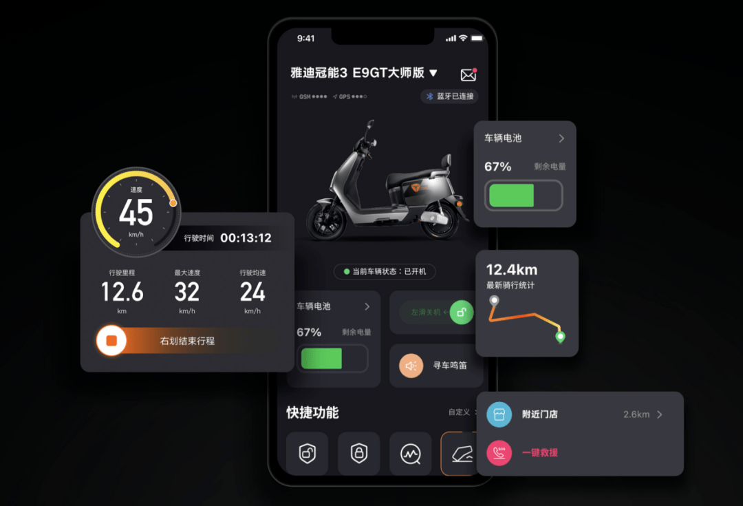 该车主打智能,搭载了雅迪自研的YADEA OS智慧中枢,拥有一键钥匙共享,无钥匙解锁,蓝牙解锁,小程序解锁,手表解锁,APP解锁多种开锁方式。绑定雅迪智行APP,车辆有任何异动,手机,车辆立刻报警。拥有蓝牙解锁,电子围栏,支持超20项智能功能。