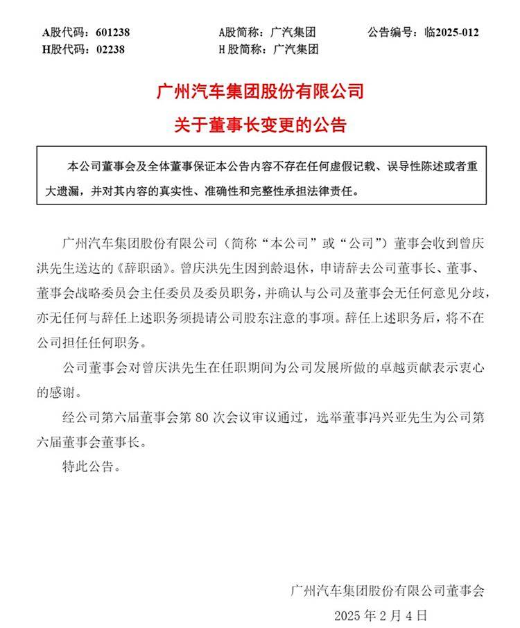春节假期即将结束之时,也就是2月4日,广汽集团已提前进入工作状态,并公布了一则极其重磅的人事变动消息。根据广汽集团近日发布的《关于董事长变更》公告,广汽集团董事长曾庆洪因到龄退休辞职,冯兴亚则接棒相应的职位。