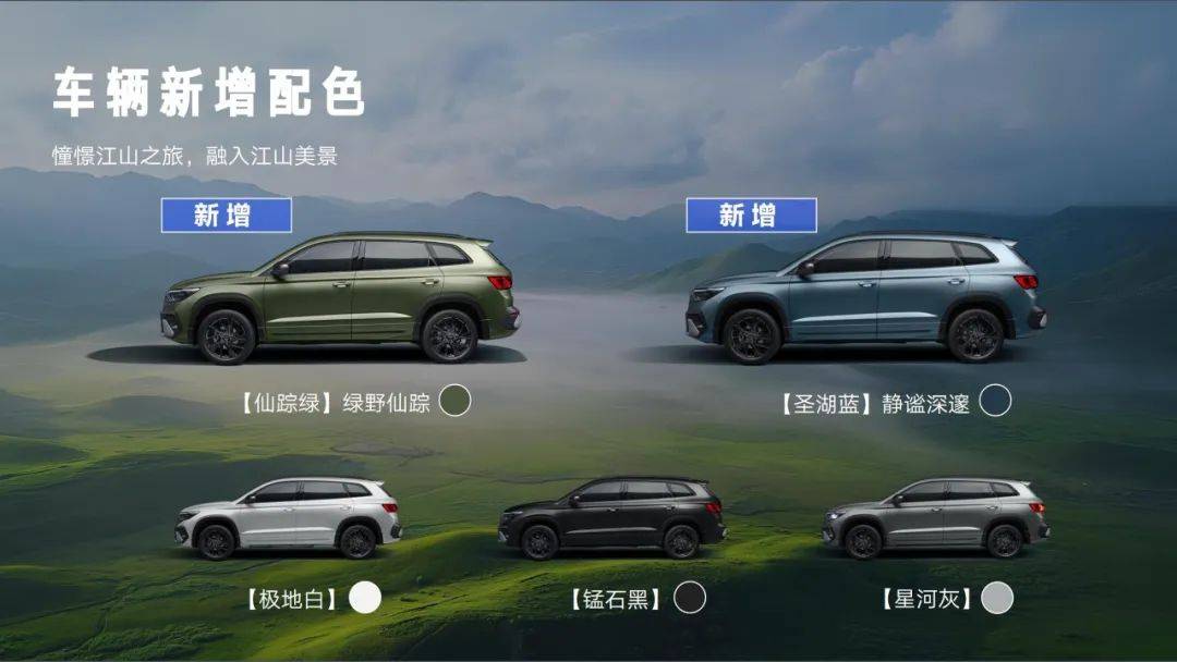 前脸绿野星辰点阵格栅、车身风行侧翼同色侧围,与山河揽峰前后包围设计融为一体,动感而不失优雅。新增圣湖蓝和仙踪绿2种车色,颜色纯粹,颜值能打,是用户打卡千里江山的最佳“拍档”。