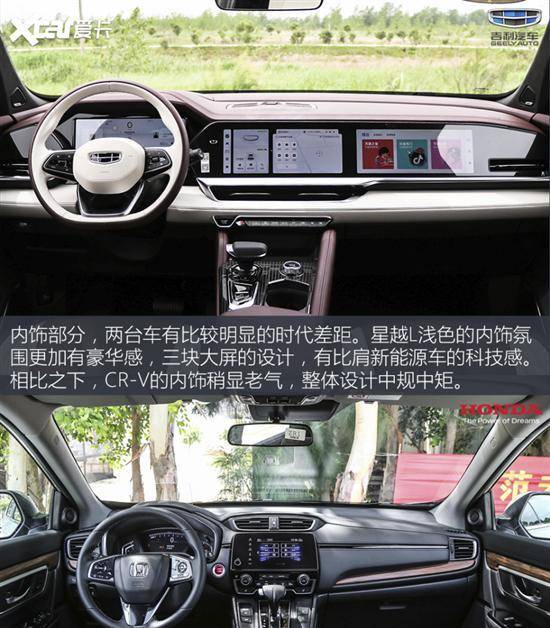 内饰方面,CR-V是几年之前推出的,整体设计语言延续了改款前车型的风格,所以整体的内饰氛围与星越L确实差别较大。作为新时代的产物,星越L在内饰上吸收了不少新能源车的前卫设计,科技感把握得相当到位。