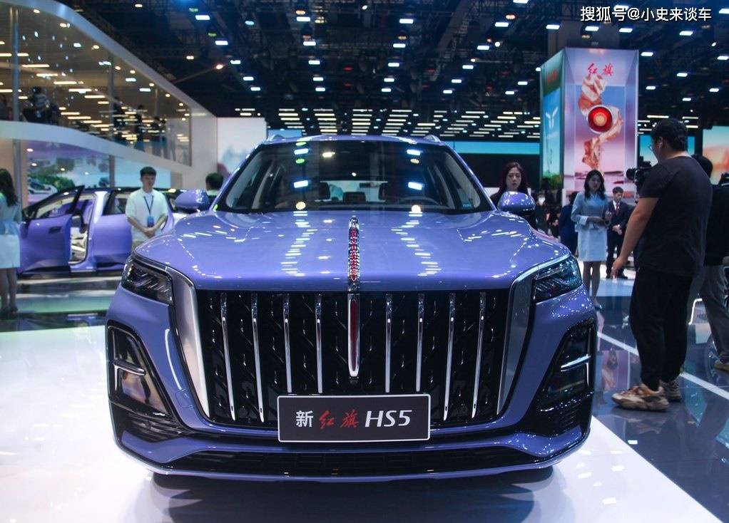 今天为大家介绍的这款车型就是全新的红旗HS5,新车共推出5款车型,尝鲜价为18.38-24.98万元。尤其是采用了红旗家族最新的家族前脸设计,动力方面也进行了升级,并将于3天后也就是5月21日正式上市,新车的前脸部分与红旗H9的造型十分相似,大尺寸的瀑布式中网内部有着多条纵置的镀铬饰条镶嵌来增加档次感,而且两侧还有着宽厚的金属饰板包裹,与大尺寸的灯组相连接,增加了新车的整体感,并且出众的车标也是从机盖中央一直延伸至中网部分,点亮后的品牌辨识度也是十分的出色,而且保险杠两侧还有着大尺寸的光源设计,结合熏黑饰板以及中央熏黑饰条的连接,就像是熏黑进气的造型一般增加运动氛围。