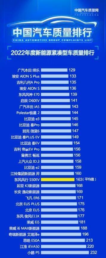 现在,新能源车发展的如火如荼,很多人选择购买。数以百万的新能源车从工厂走向市场,难免有的车质量不过关会出现故障。基于大家对新能源车质量的关心,中国汽车质量网也进行了市场调查,于近日发布了《2022年新能源紧凑型车质量排行榜》。