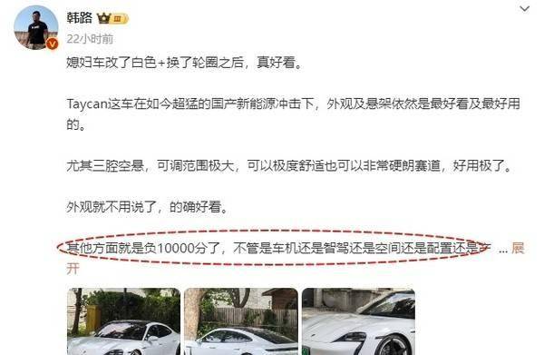 CNMO了解到,今年5月,韩路也在微博上“锐评”过保时捷Taycan。他表示:我家作为保时捷纯电车头批车主,实在感受不好,你让我以后买,我也肯定不买保时捷了。他还举例称,该车在产品体验方面带来了太多麻烦,平均每年修2次空调,并且几乎修补无望。