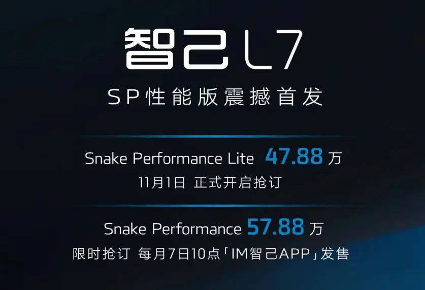 11月1日,智己L7 SP性能版车型正式上市。新车定位高性能车型,曾一度以1分42秒212的圈速纪录,击败AMG EQS和保时捷TaycanTurbo S成为浙江国际赛车场最速量产电动车。新车共推出2款车型,售价区间为47.88万-57.88万元。
