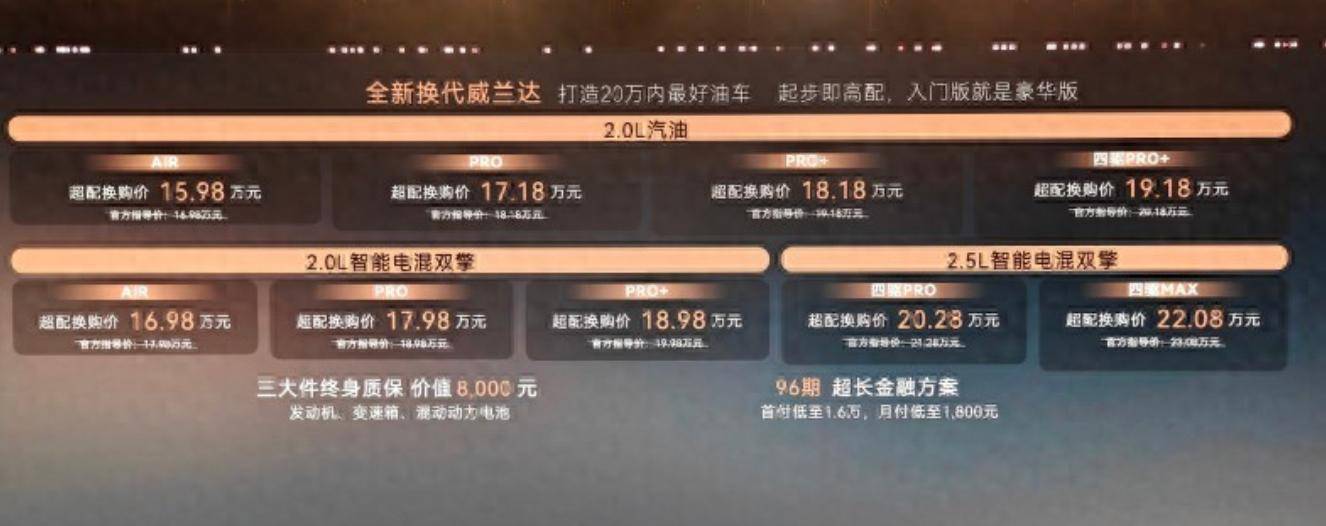 不过,我们可以简单看看门槛。首先,两款车的最低入手价,都是16.98万;而最便宜的四驱入手价,也就是2.0升自吸四驱入门版,威兰达要20.18万;而荣放只要18.98万。