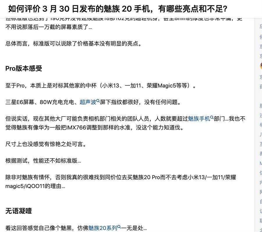 “除非对魅族有情怀,否则我真的很难找到同价位去买魅族20 Pro而不去考虑小米13/一加11/荣耀magic5/iQOO11的理由…”曾经的魅族用户在知乎上吐槽。