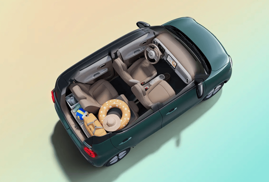 空间方面,后备厢在后排座椅5:5比例放倒后,最大能扩展到838L,全车一共规划了20处储物空间。对于一台微型电动车来说,这个储物能力已经够应付周末短途出游了。