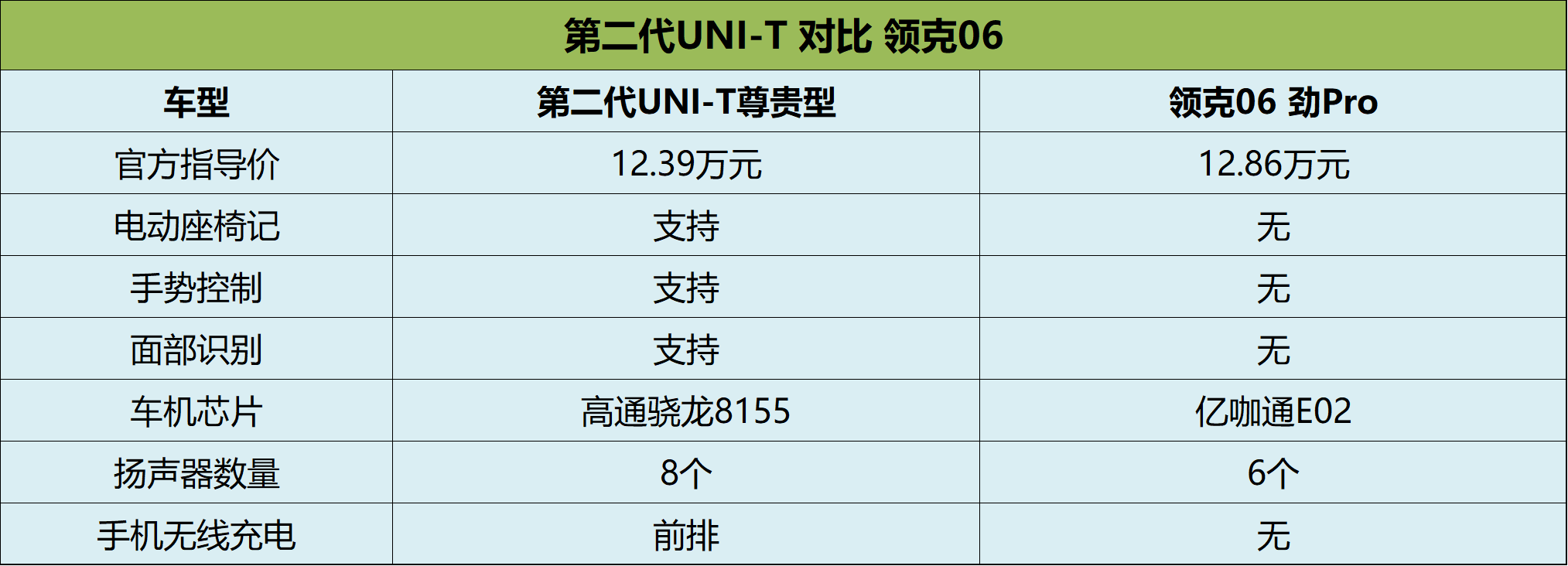 并且通过上图对比可以看到,第二代UNI-T支持的电动座椅记忆、手势控制、面部识别、手机无线充电等主流配置,领克06均不支持,由此也可看出两台车的差别。