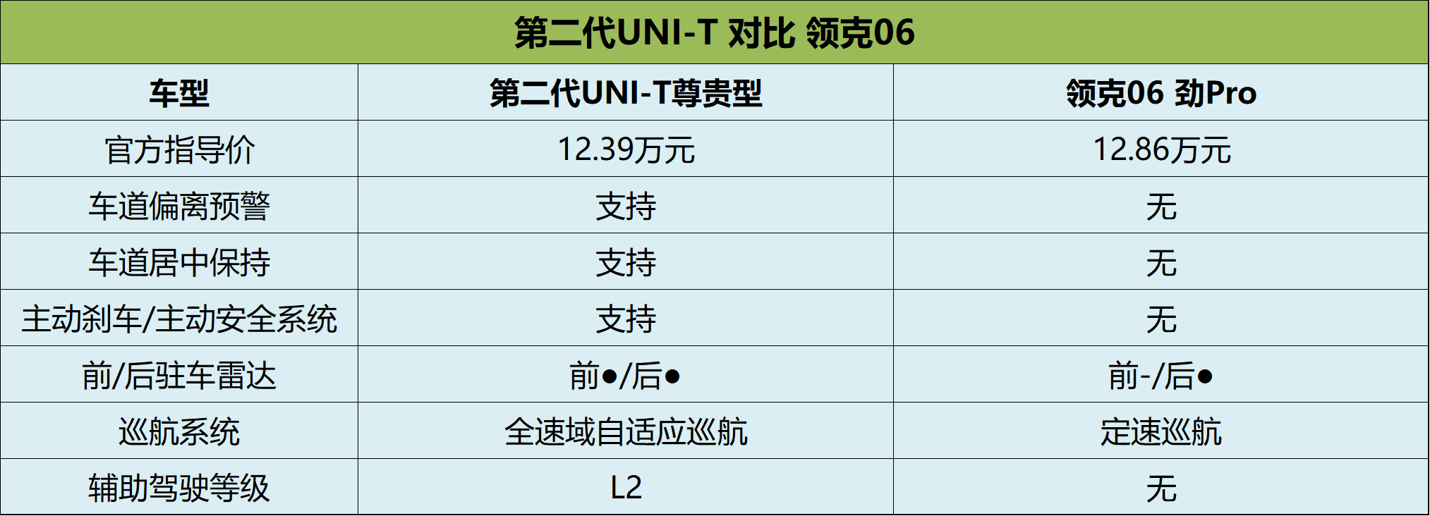 而在智能驾驶领域,在第二代UNI-T指导价格更低的情况下,配备全速域自适应巡航系统,支持L2级辅助驾驶功能可以实现车道居中保持、车道偏离预警、主动刹车等多项安全功能;而领克06,则仅有最基本的定速巡航功能,也没有过多的主动安全设施,所以在配置和智能安全维度方面,显然第二代UNI-T有更足的诚意。