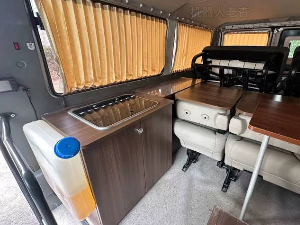 车内右侧是一张木制橱柜,下面有水有电,上面有洗菜池,打开车窗就可以做饭。