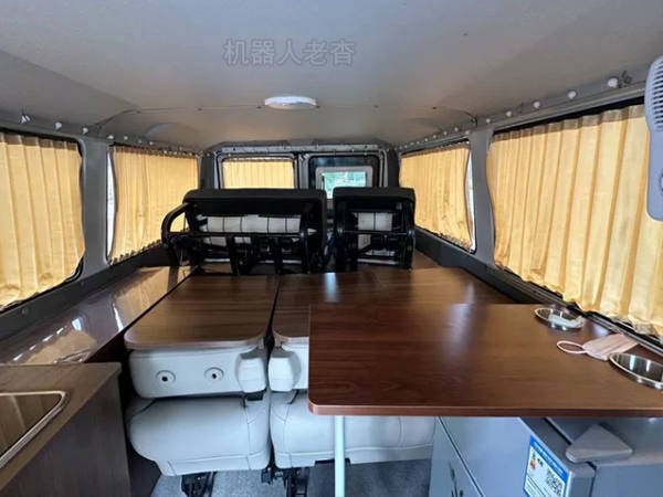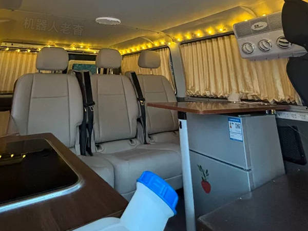后排独立三人位座椅,前面添置了一张简易折叠桌,下面是一台车载小冰箱。