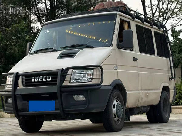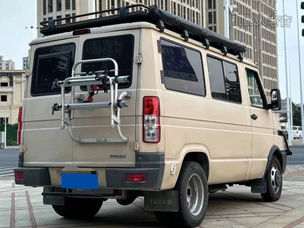 这是一台依维柯得意,柴油2.5T排量,手动5挡,3门4座,通身土黄车漆,车顶加装了行李架,左尾配备了爬梯。
