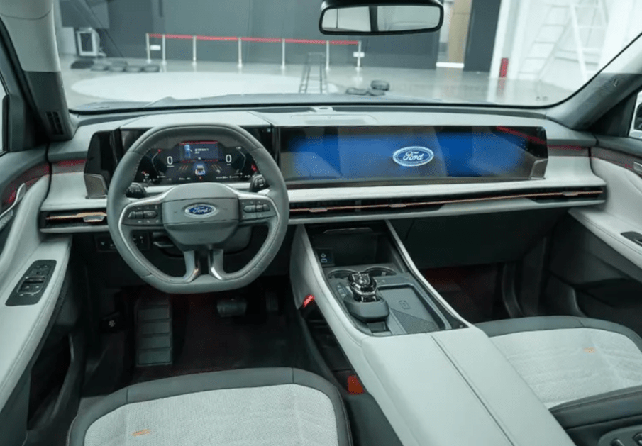 内饰设计方面,它采用了与福特EVOS、全新一代蒙迪欧、全新一代福克斯等车型采用相同的设计风格,超大尺寸的屏幕是它车内最大的特点。另外,全新锐界L还分为普通版和ST-Line两种车型,普通版车型采用米色与黑色内饰,ST-Line车型则为全黑色内饰,并搭配红色装饰以及椅背处的“ST-Line”红色标识。