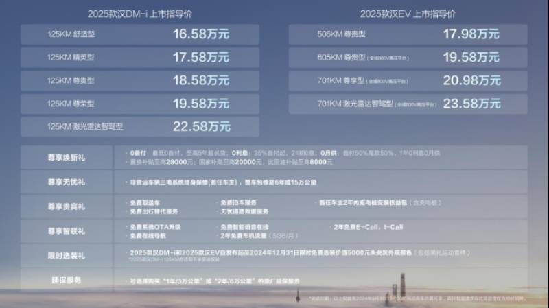 其中,2025款汉EV共推出4款车型,售价17.98万~23.58万元;2025款汉DM-i共推出5款车型,售价16.58万~22.58万元。同时,比亚迪为用户准备了包括“尊享焕新礼、尊享无忧礼、尊享贵宾礼、尊享智联礼、限时选装礼、延保服务”六重购车礼遇。值得一提的是,2024年12月31日前,购车可限时免费选装未央灰车色与黑化运动套件,总价值5000元。