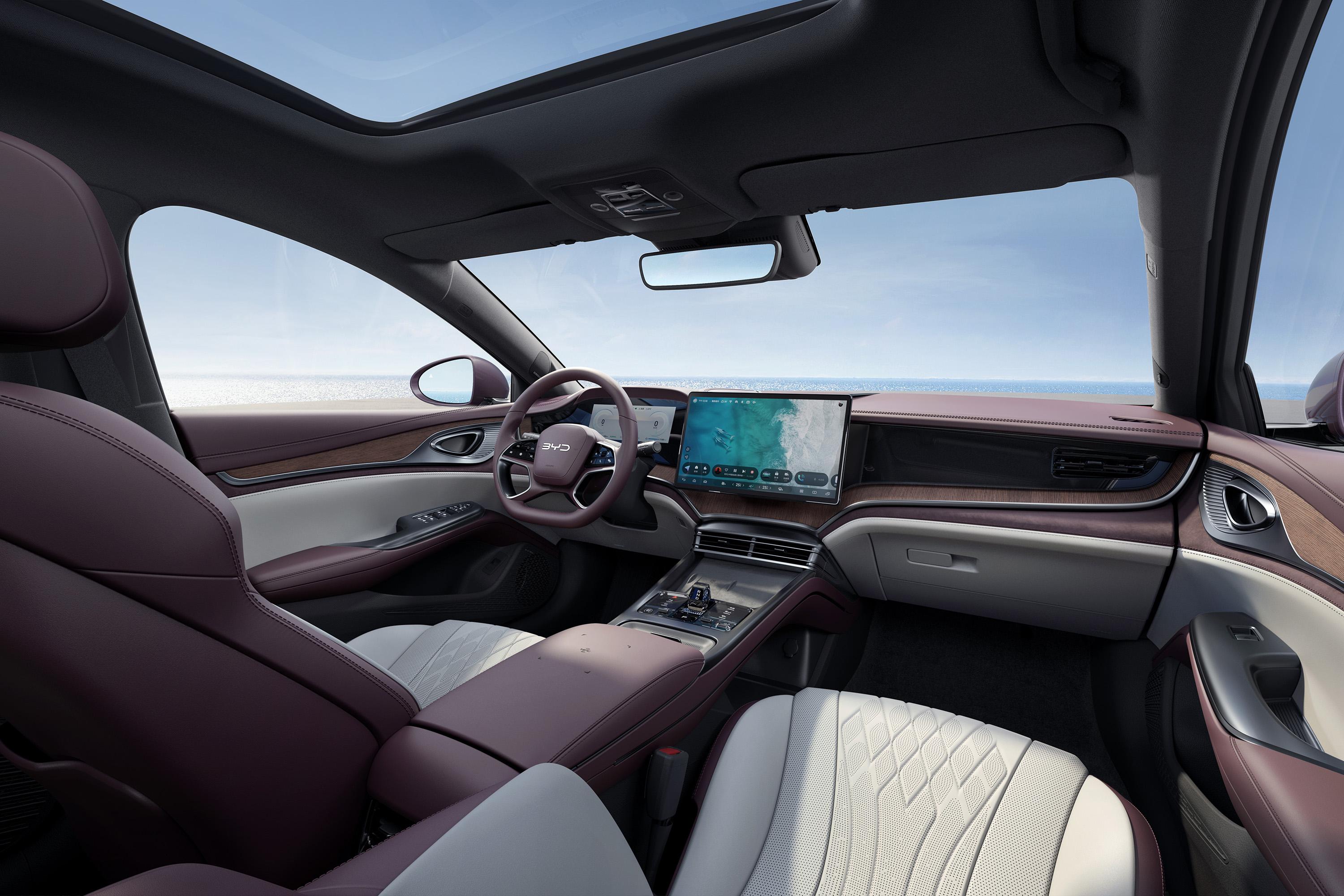 来到车内,海豹DM-i依旧延续了家族化的内饰设计风格,不同的是它的中控台更为平直,四幅式的方向盘也是全新设计,表面为皮质包裹,整体看上去更显大气。科技感方面,它配备了10.25英寸全液晶仪表、15.6英寸自适应旋转中控屏以及HUD抬头显示系统,中央出风口下方还带有手机无线充电板,充电功率可以达到50瓦,水晶电子挡杆的设计则是与海豹EV保持一致。