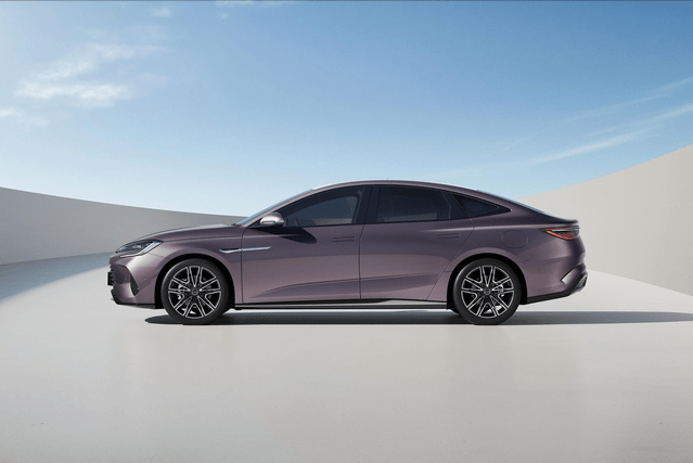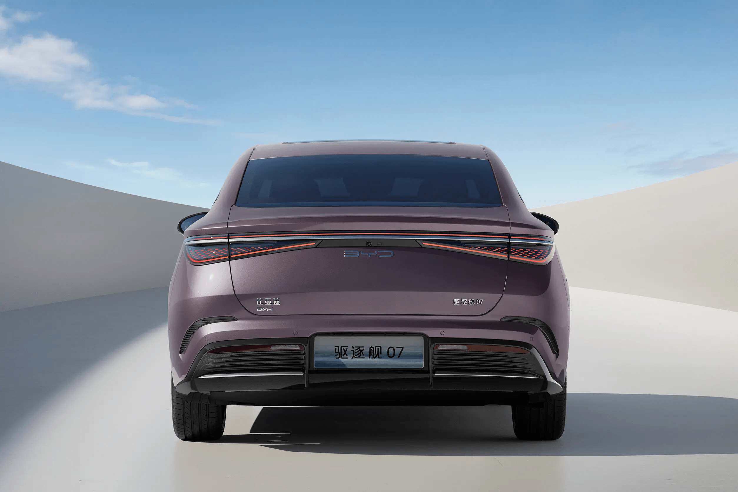 侧面采用了溜背式的设计,贯穿式的腰线从车头一路上扬至车尾,呈现出前低后高的效果,增添了运动感,和海豹一样,新车也配备了隐藏式的门把手,并且后排还用上了隐私玻璃。
