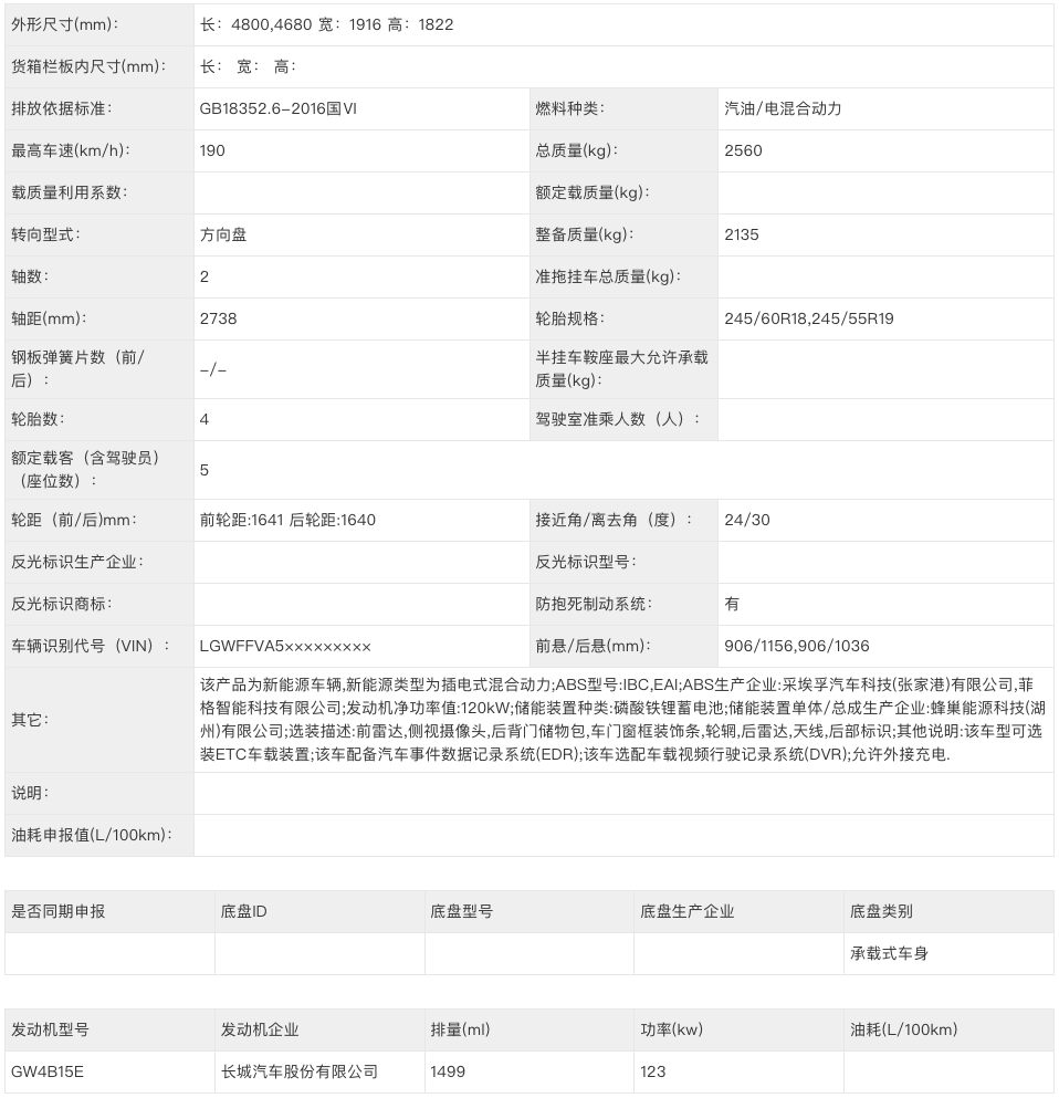 尺寸方面,新车长宽高分别为4800/1916/1822mm,轴距为2738mm,车内座椅为5座布局。动力方面,新车将搭载插电式混合动力系统,其中,代号为GW4B15E的1.5T发动机最大功率为167马力,并匹配磷酸铁锂电池组。