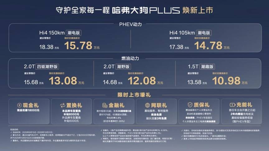 价格方面,新车诚意十足。燃油版1.5T潮趣版限时换新价10.98万元(官方指导价13.58万元),2.0T潮野版12.08万元(官方指导价14.68万元),2.0T四驱潮野版13.08万元(官方指导价15.68万元);PHEV版Hi4 105km潮电版14.78万元(官方指导价17.38万元),Hi4 150km潮电版15.78万元(官方指导价18.38万元),降价幅度最高达2.6万元。