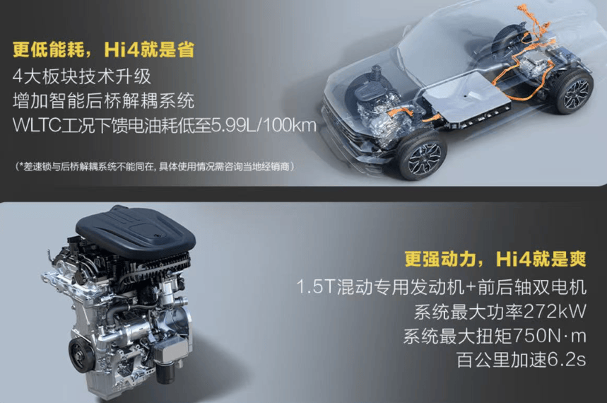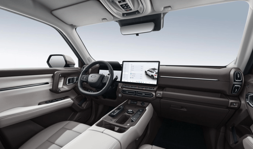 PHEV版则搭载第二代Hi4智能四驱电混技术,通过硬件、燃油技术、电能技术、算法4大板块共26项升级,新增智能后桥解耦系统,馈电油耗低至5.99L/100km;1.5T混动专用发动机+前后轴双电机组合,最大功率272kW,最大扭矩750N·m,百公里加速6.2s,堪比3.0T燃油动力;同时配备智能扭矩矢量控制系统与冰雪路面控制算法升级,面对雨、雪、泥等低附着力路面更从容,还支持7种全地形驾驶模式与全场景用电自由(220V车内电源、3.3kW外放电功率),露营时可连接灯光、音响、烧烤炉,让荒野秒变“五星级营地”。