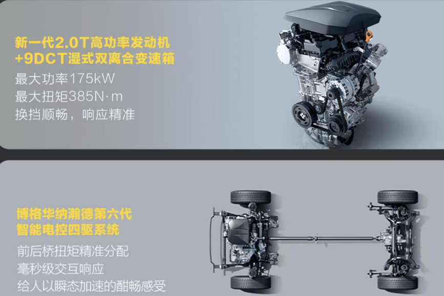 性能上,新车提供燃油与PHEV两种动力选择,适配不同家庭需求。燃油版搭载长城自研新一代2.0T高功率发动机(最大功率175kW,最大扭矩385N·m)与横置9DCT湿式双离合变速箱,配合博格华纳瀚德第六代智能电控四驱系统与后桥电控机械牙嵌式差速锁,支持9种全地形驾驶模式(含雪地、泥地、沙地等),接近角24°、离去角30°、纵向通过角21°、空载最小离地间隙200mm、极限涉水深度560mm,轻松应对郊外复杂路况。