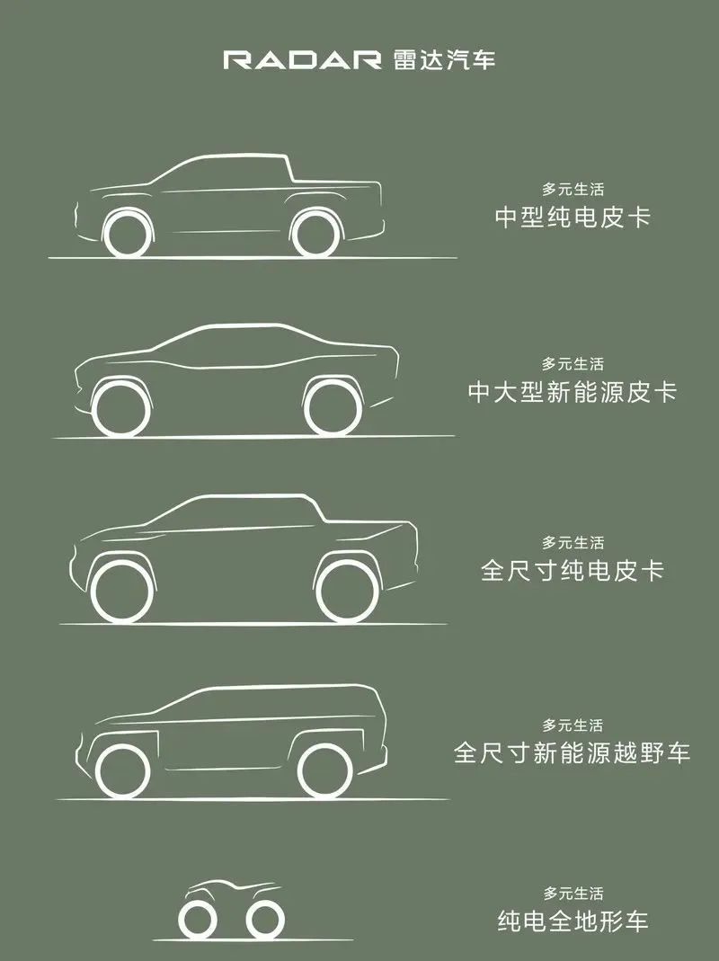 近几年来,国内乘用车市场竞争十分激烈,传统燃油车与新能源汽车之争、自主品牌和合资品牌之争,用“惨烈”来形容一点也不为过。面对日益饱和的轿车、SUV市场,各大车企发展空间有限,所以在细分市场中发力也成为各大厂商的战略目标,而放眼新能源皮卡市场,解禁利好政策逐年增加,户外生活逐渐多样化,纯电动皮卡也将成为新的市场增长点。根据规划,未来雷达汽车将推出包括中型纯电皮卡、中大型新能源皮卡、全尺寸纯电皮卡、越野SUV、ATV等多元化产品,动力模式包括纯电和混动类型。