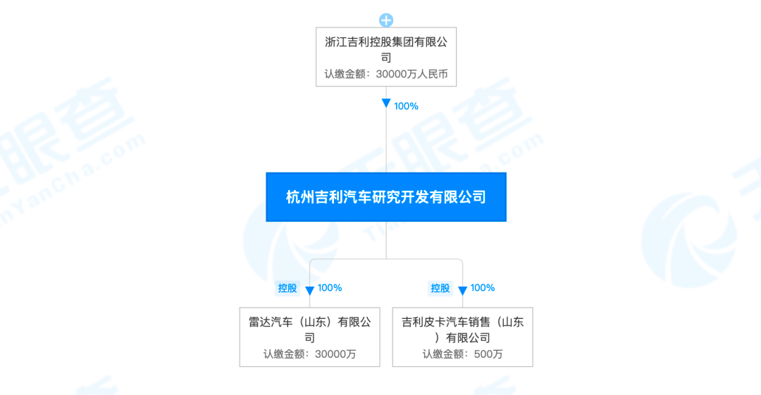 2021年11月,吉利商用车集团将皮卡业务剥离,计划转型成为高端、电动化品牌,对标美国新势力品牌Rivian。2022年4月,吉利控股注册全新品牌“RADAR”,成为吉利控股子品牌,致力于打造高端新能源皮卡。天眼查显示,雷达汽车(山东)有限公司成立于2021年11月,法定代表人为凌世权,注册资本3亿元人民币。股权穿透显示,雷达汽车是杭州吉利汽车研究开发有限公司旗下全资子公司,而后者是吉利控股全资子公司。也就是说,雷达汽车是吉利控股全资孙公司。