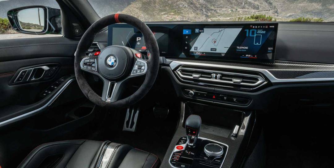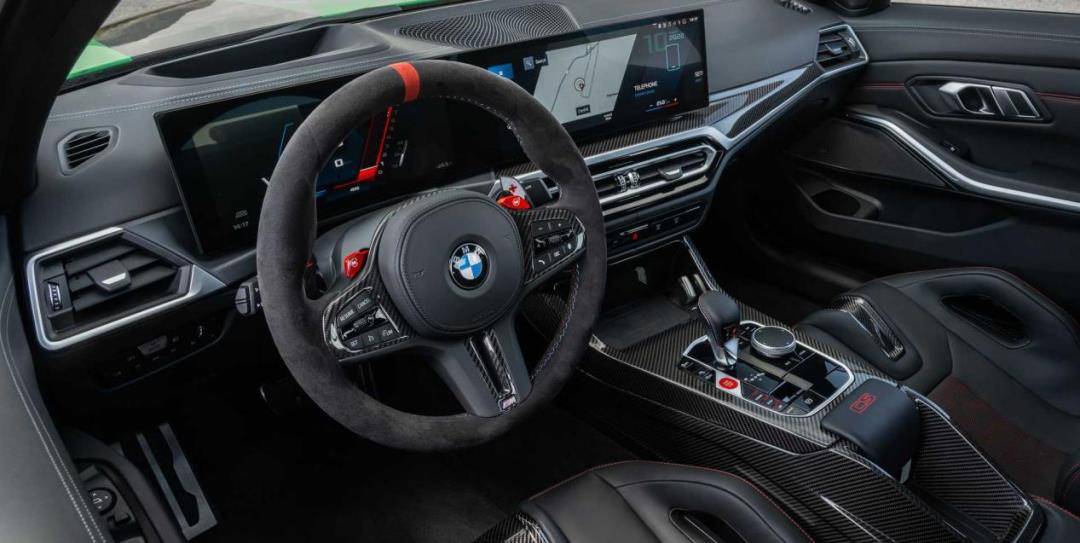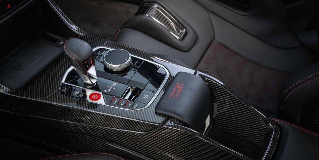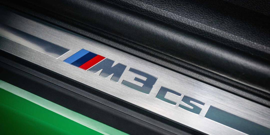 BMW M GmbH三色条纹M安全带、带有“M3 CS”字样的门槛条、碳纤维内饰条以及碳纤维换档拨片和红色回正标的M Alcantara方向盘。