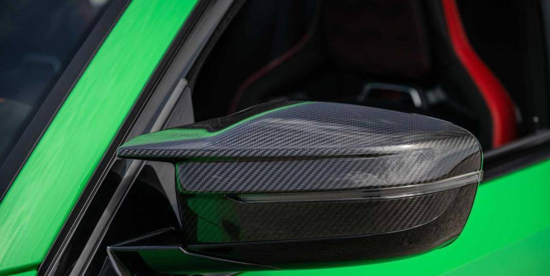 侧面轮廓与普通M3差别不大,可见宽大的翼子板形成了相当带感的宽体设计。同时,外后视镜、侧裙等部位采用了碳纤维材质,以及一体成型的碳纤维车顶,均体现了这辆M3 CS的高性能属性。