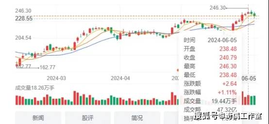 股价也从,也从5月28日的211元,涨至6月5日最高的246.3元,涨幅高达,16.6%!