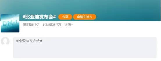 其中微博热搜,#比亚迪发布会#,有关话题的阅读量超5亿,讨论量超38万!