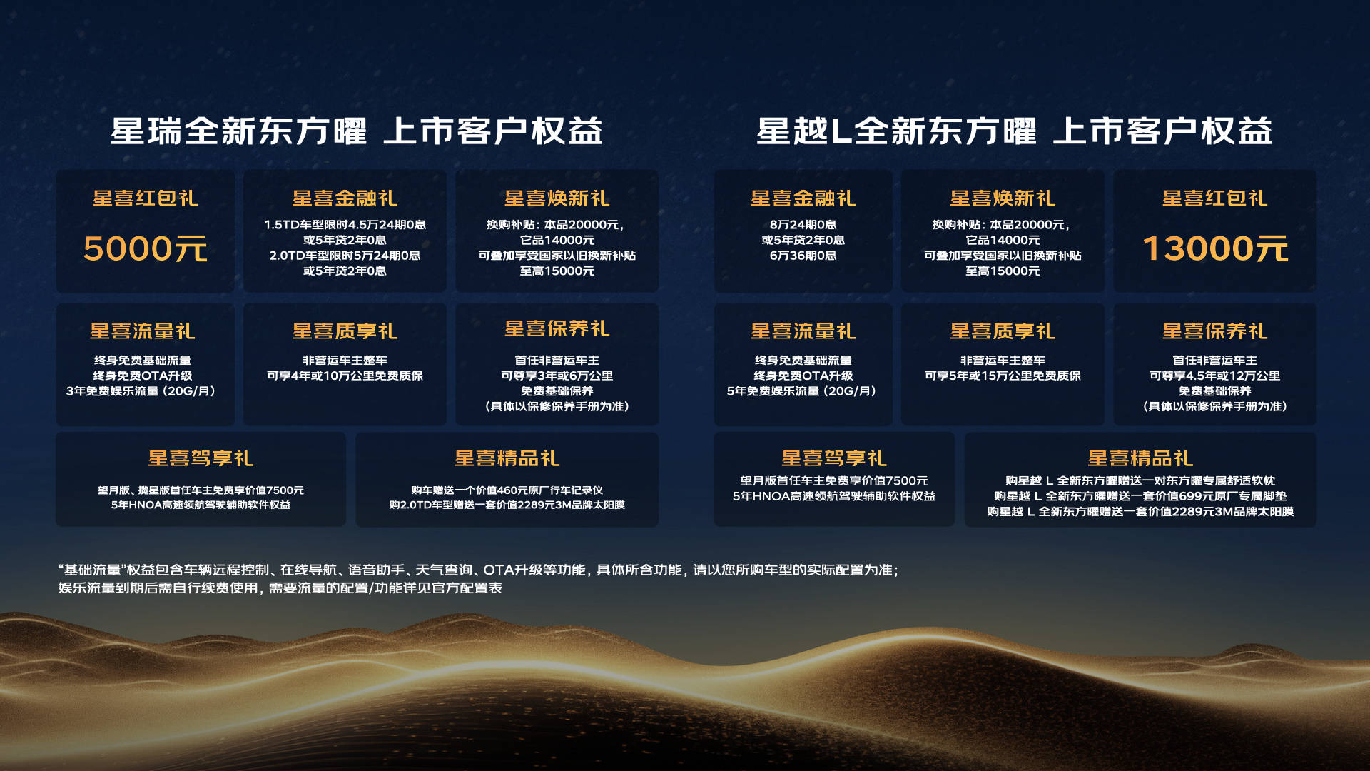 吉利中国星针对星瑞・东方曜与星越 L・东方曜分别推出七大专属权益,涵盖现金优惠、换购补贴、金融支持、售后保障等多个维度,具体权益如下: