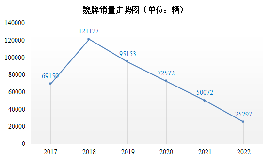 魏牌创立于2016年,2017年下半年开始大批量交付,一开始势头很猛,2017年下半年终端上险量达到69150辆,2018年全年销量达到121127辆,随后就开始一路下滑。如上图所示,魏牌的销量走势令人唏嘘(注:魏牌的上险量未包含坦克300)。