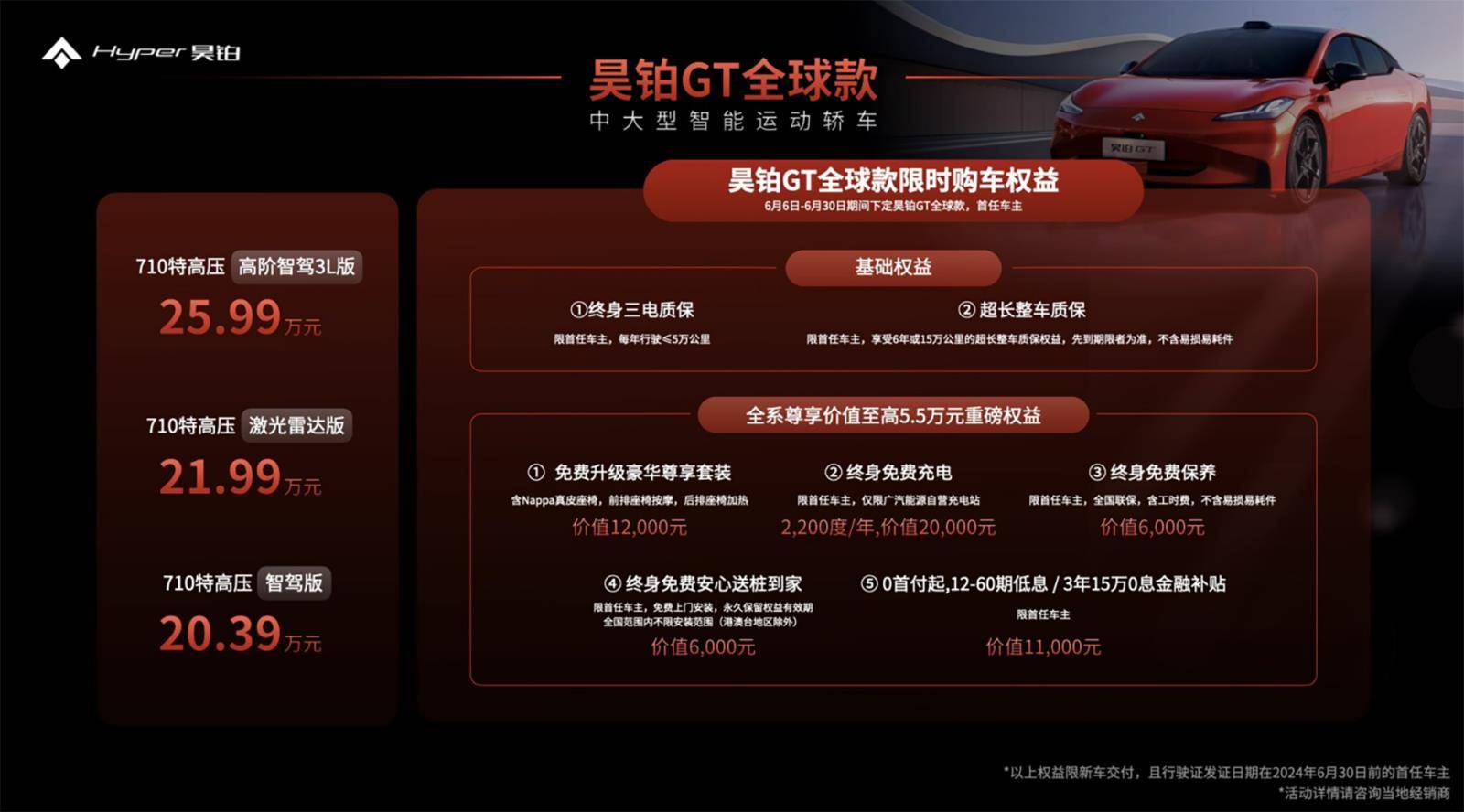 北京时间2024年6月6日,昊铂GT全球款正式上市,共推出3款车型,售价区间为20.39-25.99万元,并且推出了限时购车权益。