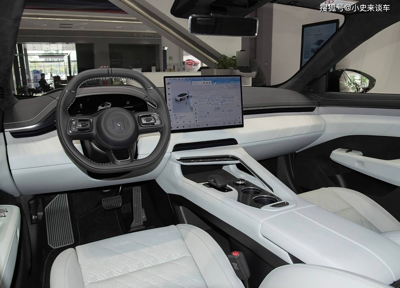 进入车内,新车延续了老款车型的设计,全液晶仪表、方向盘、中控屏以及换挡杆都是001 FR同款样式。看起来很年轻,并且中控屏采用了一块15.05英寸的OLED屏搭载了两颗英伟达Orin X芯片,算力达到了508TPOS,并将提供城市无图智能辅助驾驶能力。同时,新车还增加了并线盲区监测功能,即打开转向灯后,系统将在中控屏和HUD(抬头显示功能)中显示盲区影像。而且大面积的软质材料包裹,结合宽厚饱满的座椅设计,乘坐起来也是很舒适,档次感出众。