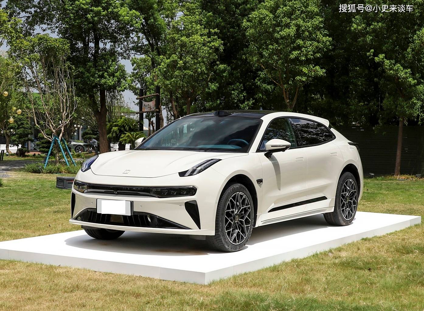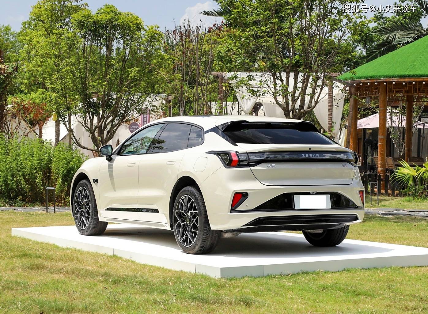 我们首先来看新车的外观设计方面,新车的车头部分整体采用了经典的家族式造型设计,有着出色的品牌辨识度,而且上扬式的日间行车灯也是经典的设计,结合下方大面积的熏黑大灯组造型细长,中央还有着黑色饰板连接,形成了贯穿式的造型来提升视觉宽度,内部精致的光源设计让新车点亮后的照明效果很出众,保险杠两侧有着内凹明显的进气口设计,中央还搭载了与极氪001 FR造型相同的前包围,增加了进气口元素,让新车的运动感更加浓郁。