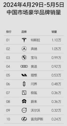今年最新一周(4月29日至5月5日),理想以5300辆跻身销冠,问界4800辆位列亚军,极氪和蔚来均斩获了3600辆跻身第三名,虽相较于特斯拉1.1万辆尚有差距,但直追传统豪华奔驰、宝马和奥迪。