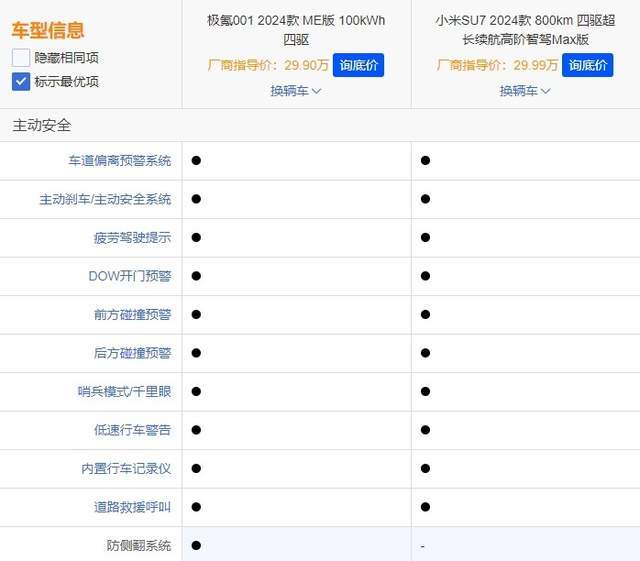 在智能安全配置方面,常规的主动安全方面两车都“武装到位”,像主动刹车、前/后碰撞预警、开门预警等等,而极氪001独有防侧翻系统,这样在行车发生极端条件时,可以很大程度避免车辆出现侧翻情况,保证车内人员安全。