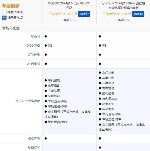 智能配置对比:小米SU7稍显占优