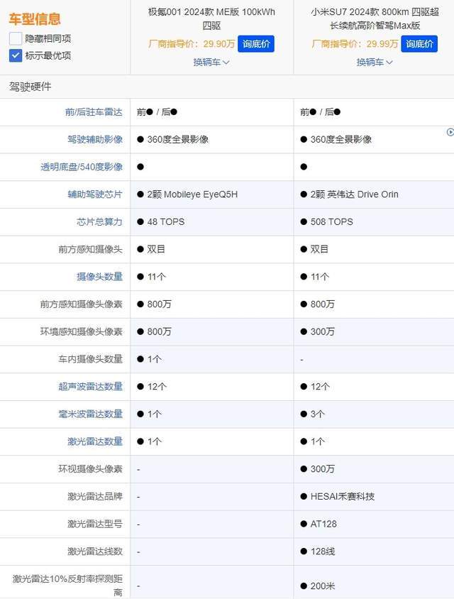 在保证驾驶安全所需要的智能硬件方面,极氪001搭载的是两颗Mobileye EyeQ5HH芯片,算力只有48TOPS,根本拿不上台面,对比之下,小米SU7搭载的是两颗英伟达Drive Orin芯片,算力达508TOPS,并且还有着3颗毫米波雷达。